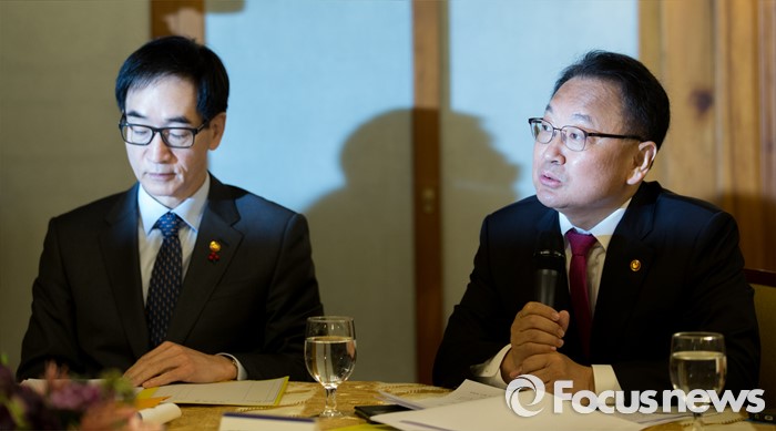 (서울=포커스뉴스) 19일 오전 서울 종로구 삼청동 국무총리공관에서 열린당·정·청 정책조정협의회에 참석한 유일호(오른쪽) 경제부총리 겸 기획재정부 장관이 모두발언을 하고 있다. 왼쪽은 이준식 사회부총리 겸 교육부 장관.