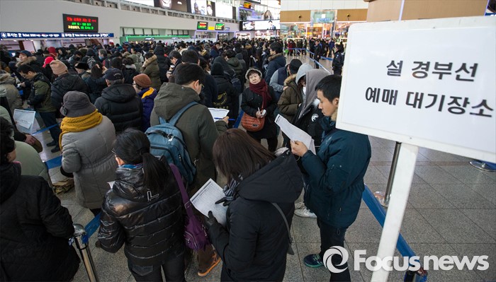 (서울=포커스뉴스) 설 승차권 현장예매가 시작된 19일 오전 서울 중구 서울역 매표소 앞에서 시민들이 승차권을 구입하기 위해 줄을 서있다. 코레일은 19일과 20일, 이틀 동안 설 연휴 열차 승차권 예매를 시작한다고 밝혔다.