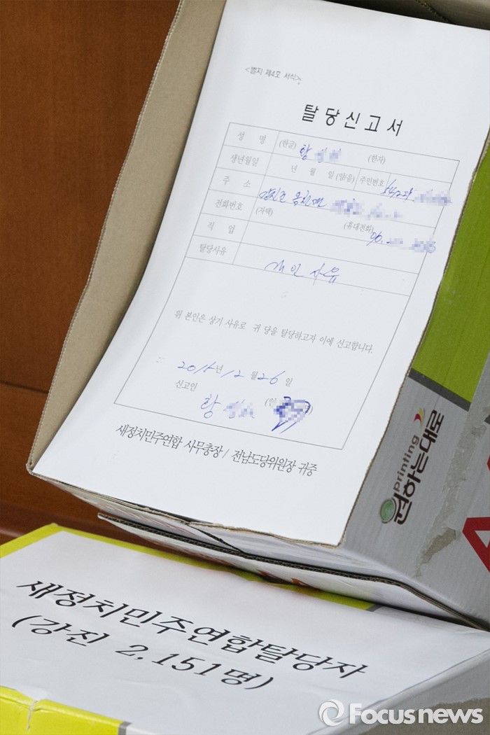 (서울=포커스뉴스) 19일 오후 서울 여의도 국회 정론관에서 열린 전남 영암·장흥·강진군 군민 더불어민주당 탈당 기자회견에 탈당신고서가 놓여 있다.