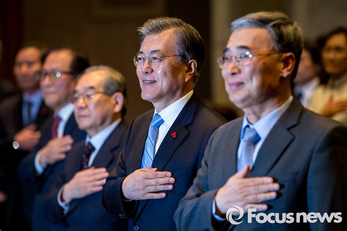 (서울=포커스뉴스) 문재인(오른쪽 두 번째)더불어민주당 대표가 19일 오후 서울 중구 프레스센터 국제회의장에서 20대 총선과 남북관계란 주제로 열린 '2016 신년토론회'에 참석해 국민의례를 하고 있다.