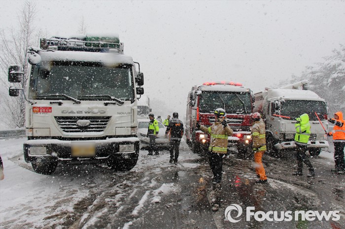 (서울=포커스뉴스) 19일 오후 12시 48분께 전북 정읍시 북면 남산리 호남고속도로 내장산IC와 태인IC 사이에서 차량 30여대가 추돌하는 사고가 발생해 경찰, 소방관, 도로공사 직원들이 사고 수습작업을 하고 있다.
