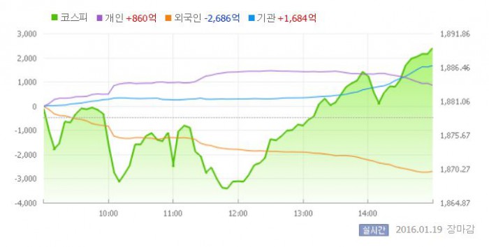 이날 코스피는 1870선에서 상승 출발했지만 외국인의 매도세에 하락 반전했다. 장 중반 중국 GDP 성장률이 발표된 이후 1860 중반까지 밀렸다가 다시 반등해 1880선을 회복했다.