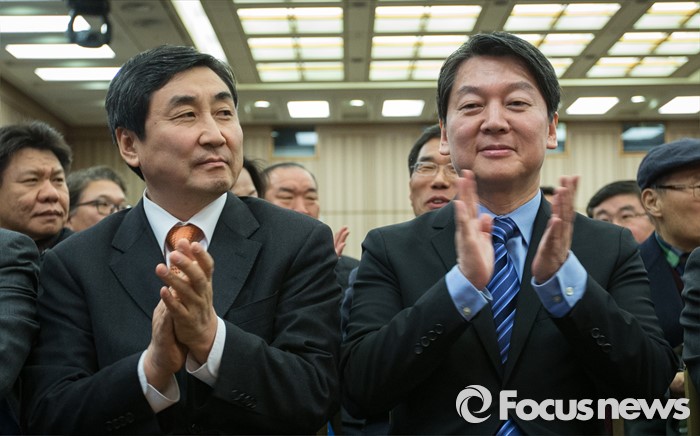 (서울=포커스뉴스) 국민의당(가칭) 안철수 의원(오른쪽)과 더불어민주당 이종걸 원내대표가 19일 오후 서울 중구 은행회관 국제회의실에서 열리는 금융노조 제51차 정기전국대의원대회에 참석해 박수를 치고 있다.