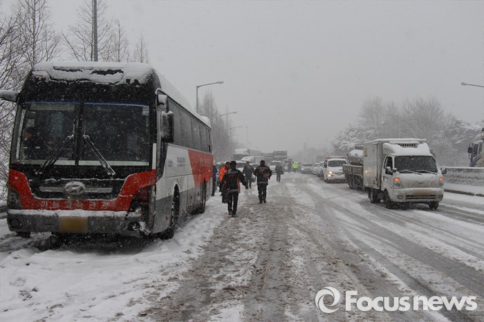 (서울=포커스뉴스) 19일 오후 12시 48분께 전북 정읍시 북면 남산리 호남고속도로 내장산IC와 태인IC 사이에서 차량 30여대가 추돌하는 사고가 발생해 경찰, 소방관, 도로공사 직원들이 사고 수습작업을 하고 있다.