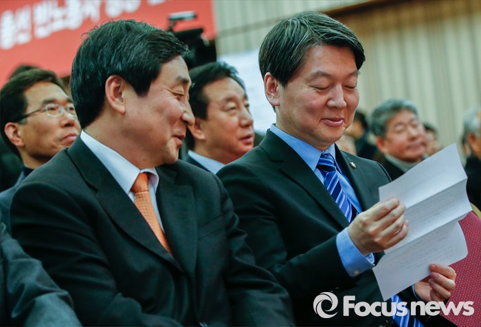 (서울=포커스뉴스) 국민의당(가칭) 안철수 의원(오른쪽)과 더불어민주당 이종걸 원내대표가 19일 오후 서울 중구 은행회관 국제회의실에서 열린 금융노조 제51차 정기전국대의원대회에 참석해 나란히 앉아 있다.