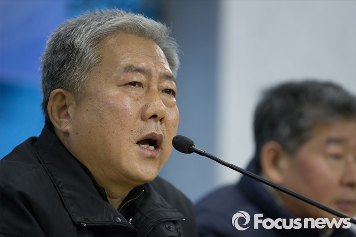 (서울=포커스뉴스) 김동만 한국노총 위원장이 19일 오후 서울 영등포구 한국노동조합총연맹에서 열린 노사정합의 파기 선언 한국노총 기자회견에 선언을 하고 있다.