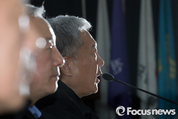 (서울=포커스뉴스) 김동만 한국노총 위원장이 19일 오후 서울 영등포구 한국노동조합총연맹에서 열린 노사정합의 파기 선언 한국노총 기자회견에 선언을 하고 있다.