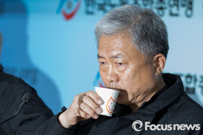 (서울=포커스뉴스) 김동만 한국노총 위원장이 19일 오후 서울 영등포구 한국노동조합총연맹에서 열린 노사정합의 파기 선언 한국노총 기자회견 시작 전 물을 마시고 있다.