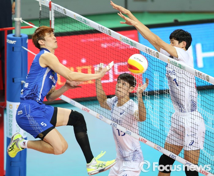 (서울=포커스뉴스) 19일 장충체육관에서 열린 '2015-2016NH농협 V-리그' 남자부 우리카드-대한항공 경기에서 대한항공 최석기의 연타 공격을 우리카드 박진우가 블로킹으로 넘기고 있다.