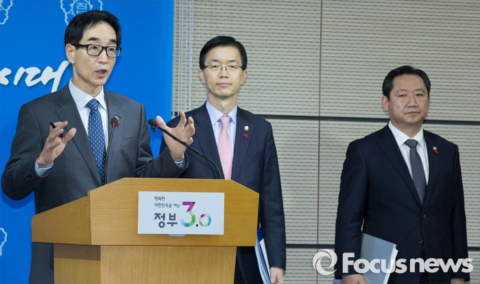 (세종=포커스뉴스) 이준식 사회부총리 겸 교육부장관이 19일 오전 세종시 정부세종청사 교육부 공용브리핑룸에서 국민행복분야 정부합동 업무보고 사전브리핑을 하고 있다. 왼쪽부터 이 부총리, 방문규 보건복지부 차관, 권용현 여성가족부 차관.
