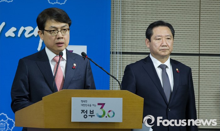 (세종=포커스뉴스) 고영선 고용노동부 차관이 19일 오전 세종시 정부세종청사 교육부 공용브리핑룸에서 국민행복분야 정부합동 업무보고 사전브리핑을 마치고 취재진의 질문에 답변하고 있다. 오른쪽은 권용현 여성가족부 차관.