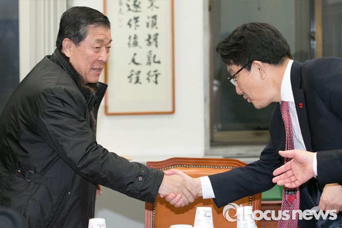(서울=포커스뉴스) 새누리당 총선기획단장인 황진하(왼쪽) 사무총장과 권성동 전략기획본부장이 20일 오전 서울 여의도 국회에서 열린 제1차 총선기획단 회의에 참석해 악수하고 있다.