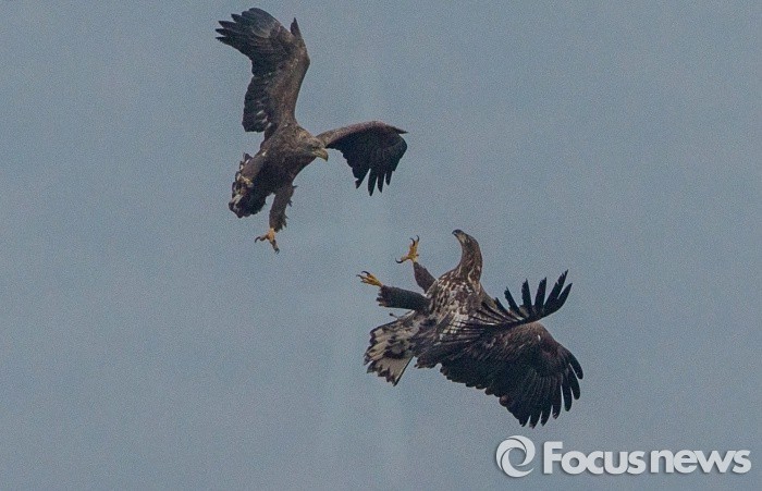 (하남=포커스뉴스) 한파주의보가 내려진 20일 오전 경기도 하남시 미사리 한강변이 모두 얼어붙은 가운데, 이곳에서 월동중이던 겨울철새 흰꼬리수리(천연기념물 243호)가 공중에서 영역다툼을 하고 있다.