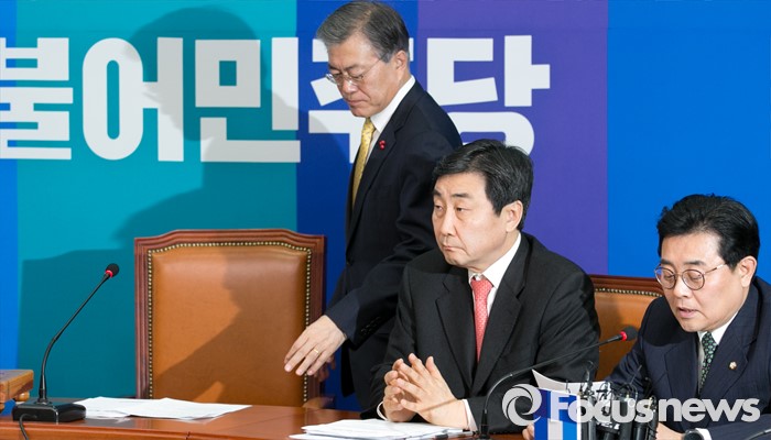 (서울=포커스뉴스) 문재인 더불어민주당 대표가 20일 오전 서울 여의도 국회에서 열린 최고위원회의에 잠시 자리를 비운 뒤 다시 참석하고 있다. 왼쪽부터 문 대표, 이종걸 원내대표, 전병헌 최고위원.