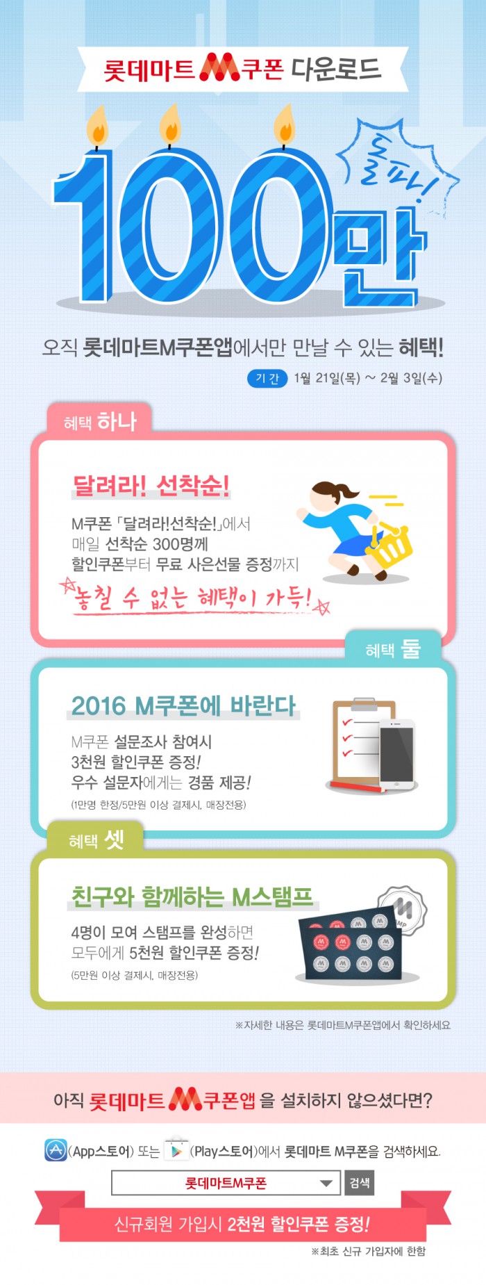 (서울=포커스뉴스) 롯데마트는 M쿠폰 애플리케이션(이하 앱)의 다운로드 수가 구글 플레이스토어와 애플 앱스토어에서 총 100만을 넘어섰다. 앱 출시일인 지난해 4월30일부터 지난 19일까지 약 9개월만이다.