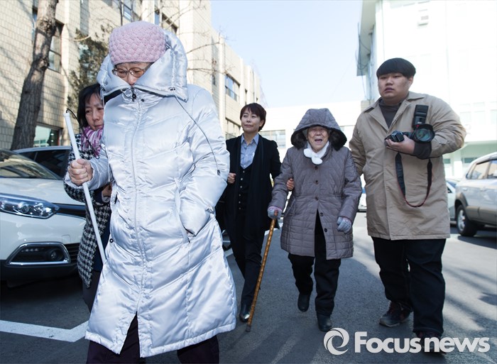 (서울=포커스뉴스) 책 '제국의 위안부'를 써 일본군 위안부 피해자들의 명예를 훼손했다는 혐의로 재판을 받게 된 박유하 세종대 국제학부 교수에 대한 공판이 열린 20일 오전 서울 광진구 동부지방법원 법정으로 위안부 피해자 할머니들이 들어서고 있다.