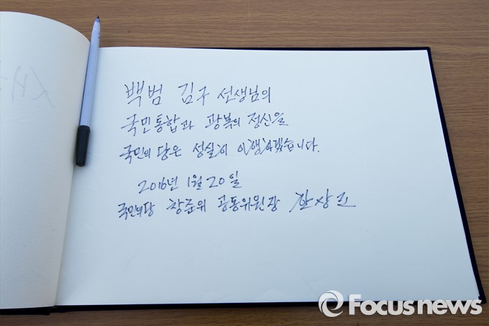 (서울=포커스뉴스) 한상진 국민의당 창당준비위원장이 20일 오전 서울 용산구 백범 김구 선생 묘역을 참배한 뒤 작성한 방명록.