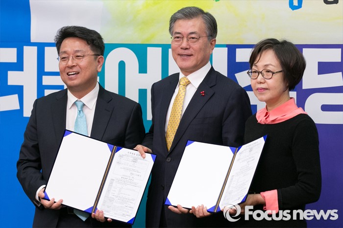 (서울=포커스뉴스) 이철희(왼쪽부터) 두문정치연구소 소장과 문재인 대표, 권미혁 한국여성단체연합 전 대표가 20일 오전 서울 여의도 국회 더불어민주당 대표실에서 열린 입당 기자회견에 참석해 기념사진을 찍고 있다.