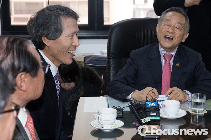 (서울=포커스뉴스) 한상진 국민의당 창당준비위원장이 20일 오전 서울 여의도 광복회를 방문해 박유철 광복회장과 대화를 나누며 웃고 있다.