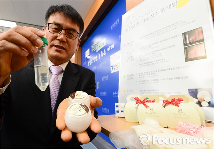 (세종=포커스뉴스) 박남건 농촌진흥청 국립축산과학원 난지축산연구소장이 20일 오전 세종시 정부세종청사 농림축산식품부 기자실에서 말(馬)기름과 말뼈로 피부노화 억제 기능이 있는 화장품 소재 개발 브리핑을 마치고 제품을 선보이고 있다.