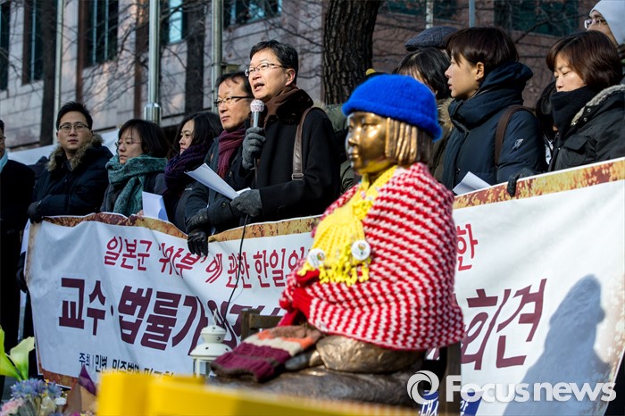 (서울=포커스뉴스) 20일 오전 서울 종로구 일본대사관 인근에서 민주사회를 위한 변호사모임 관계자들이 일본군 위안부 문제 관련 한일외교장관회담에 대한 교수, 법률가 의견서 발표 기자회견을 하고 있다.