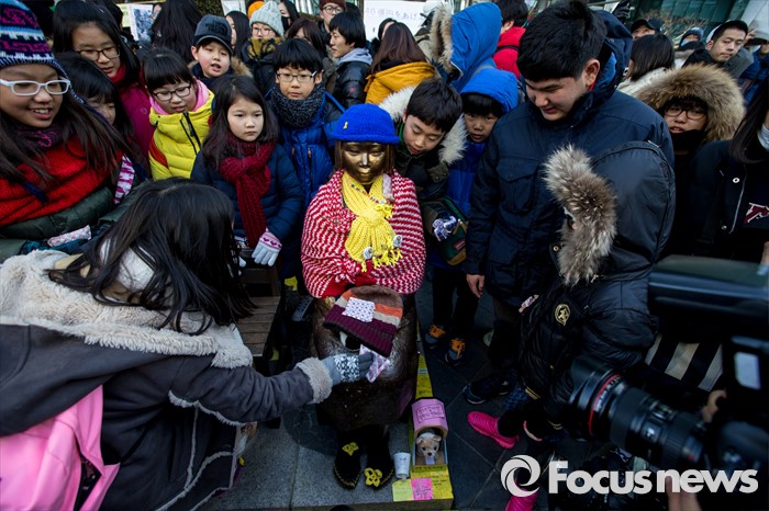 (서울=포커스뉴스) 20일 오후 서울 종로구 옛 일본대사관 앞에서 열린 제1214차 일본군 위안부 문제 해결 위한 정기수요시위에 참가한 어린이들이 소녀상에 보온용품을 올려 놓고 있다. 이날 일본군 위안부 피해자 할머니들은 연이은 혹한으로 시위에 자리하지 못했다.