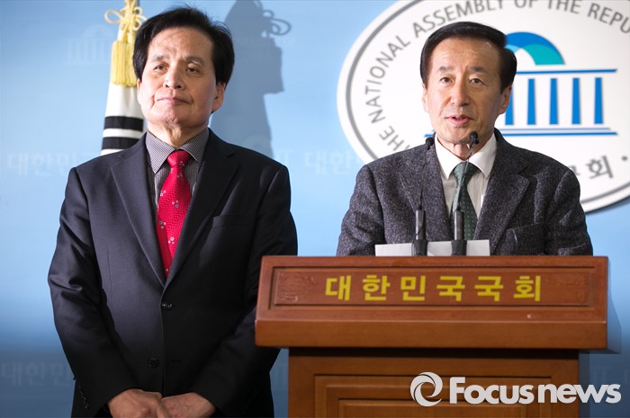 (서울=포커스뉴스) 20일 오후 서울 여의도 국회 정론관에서 유선호(오른쪽), 장세환 전 의원이 박주선 무소속 의원이 창당준비 중인 통합신당 합류 기자회견을 하고 있다.
