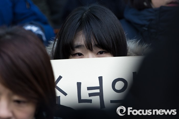 (서울=포커스뉴스) 20일 오후 서울 종로구 옛 일본대사관 앞에서 열린 제1214차 일본군 위안부 문제 해결 위한 정기수요시위에서 참가자들이 한일 위안부 합의 무효를 촉구 하고 있다. 이날 일본군 위안부 피해자 할머니들은 연이은 혹한으로 시위에 자리하지 못했다.