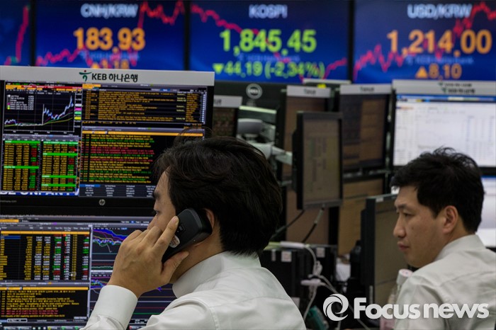 (서울=포커스뉴스) 코스피 지수가 외국인과 기관의 매도 공세에 전 거래일보다 44.19포인트(2.34%) 하락한 1,845.45에 거래를 마친 20일 오후 서울 중구 KEB하나은행 딜링룸에서 딜러들이 업무를 보고 있다. 이날 원달러 환율은 전 거래일보다 8.1원 오른 1214원에 거래를 마감했다.