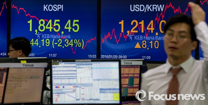 (서울=포커스뉴스) 코스피 지수가 외국인과 기관의 매도 공세에 전 거래일보다 44.19포인트(2.34%) 하락한 1,845.45에 거래를 마친 20일 오후 서울 중구 KEB하나은행 딜링룸에서 딜러들이 업무를 보고 있다. 이날 원달러 환율은 전 거래일보다 8.1원 오른 1214원에 거래를 마감했다.