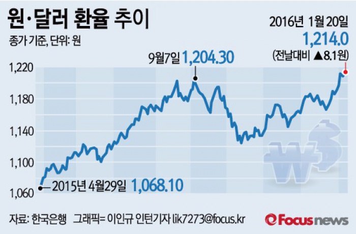 20일 서울 외환시장에서 원·달러 환율은 1214.0원으로 마감해 2010년 7월 19일 종가(1215.6원)이후 5년 5개월여만에 최고치를 기록했다.
