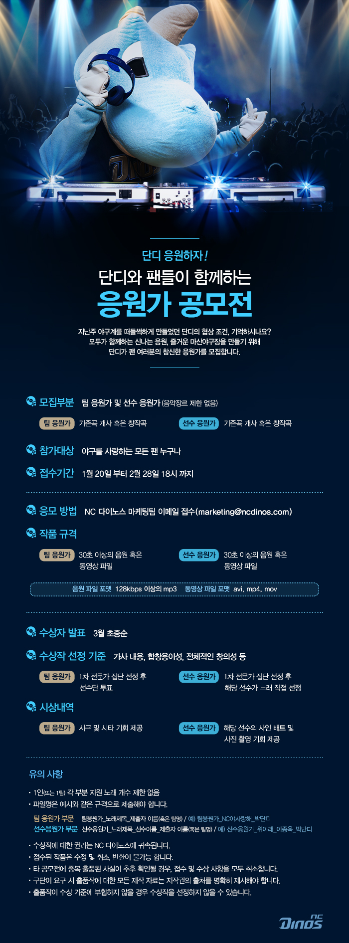 NC '2016시즌 응원가 공모전'은 팀 응원가와 선수 응원가 모두가 대상이다. 창작곡과 기성곡 개사 2부문으로 열린다.