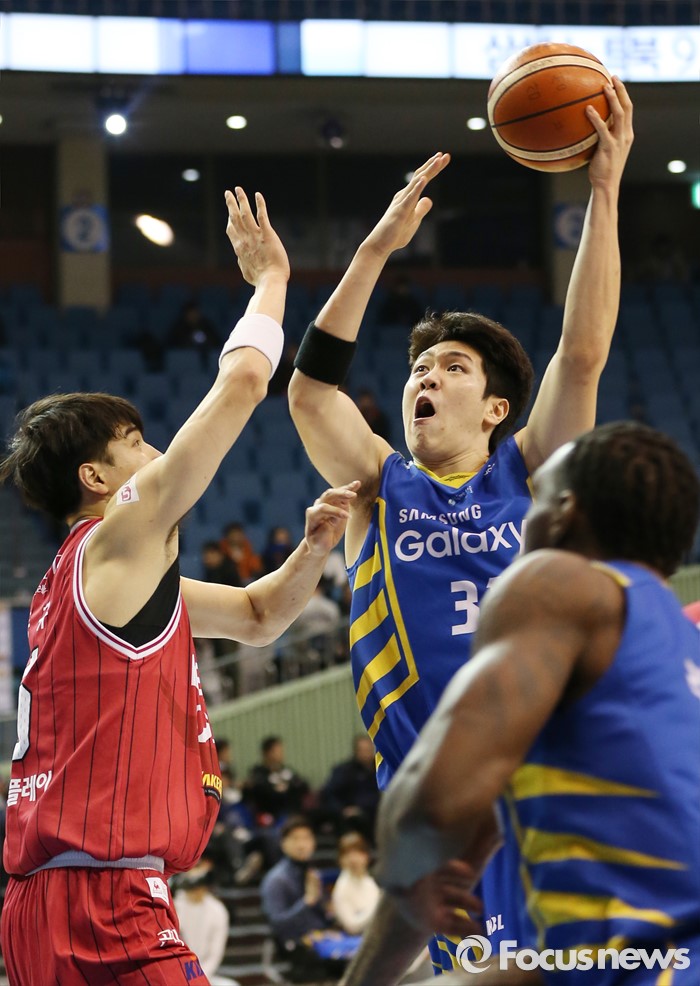 (서울=포커스뉴스) 20일 서울 잠실실내체육관에서 열린 2015-2016 프로농구 삼성-LG 경기에서 삼성 김준일이 LG 김종규의 마크를 받으며 점프슛을 쏘고 있다.