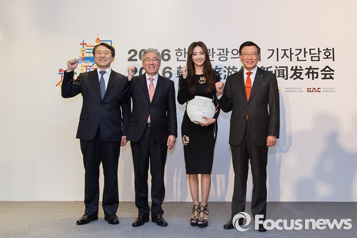 (서울=포커스뉴스) 김종덕 문화체육관광부장관이 20일 중국 베이징 21세기극장에서 열린 2016 한국관광의 해 개막행사을 앞두고 열린 기자간담회에서 배우 한채영과 홍보대사 위촉패를 전달하고 기념촬영하고 있다. 왼쪽부터 정창수 한국관광공사 사장, 김종덕 장관, 한채영, 박삼구 한국방문위원회 위원장. <사진제공=문화체육관광부>