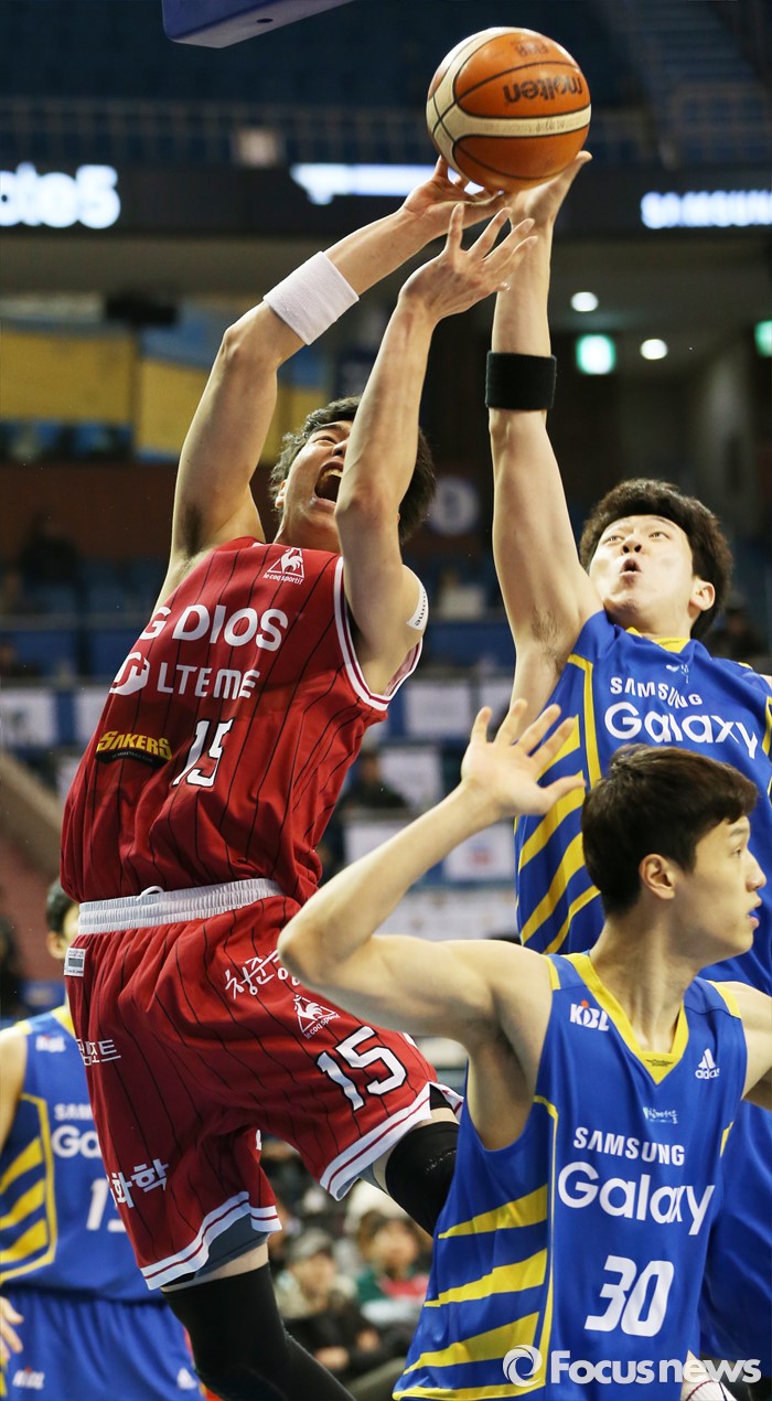 (서울=포커스뉴스) 20일 서울 잠실실내체육관에서 열린 2015-2016 프로농구 삼성-LG 경기에서 LG 김종규의 골밑슛을 삼성 김준일이 저지하고 있다.