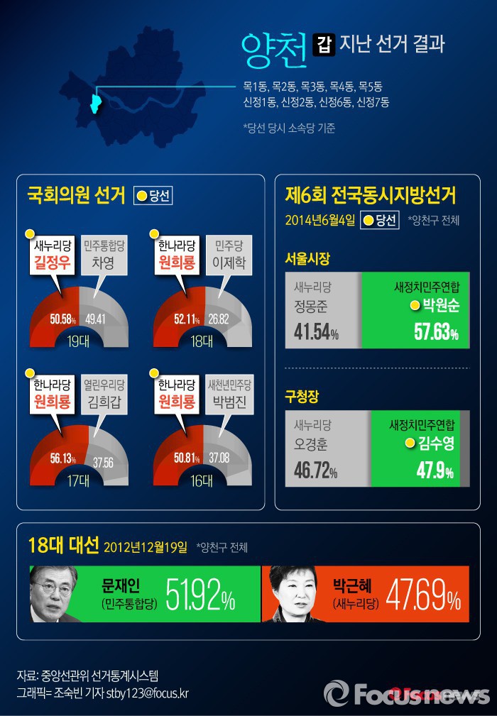 양천구는 목동과 신정동 중심의 양천 갑과 신월동과 신정3·4동으로 구성된 양천 을에서 2명의 국회의원을 선출한다.
