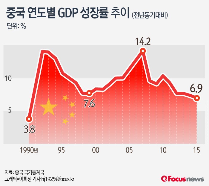 (서울=포커스뉴스) 중국 국가통계국은 19일 지난해 GDP(실질 국내총생산) 성장률이 6.9%를 기록했다고 발표했다. 이는 중국정부의 목표치인 7%보다 낮은 수치이고 1990년 3.8% 성장 이후 25년만의 최저치다.