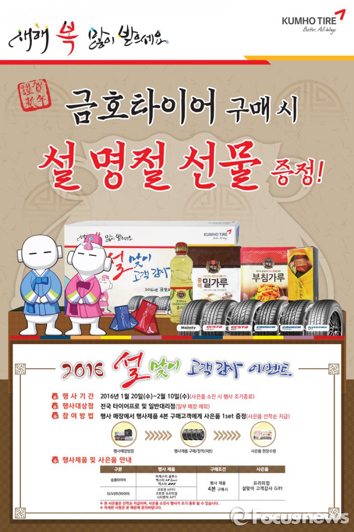 (서울=포커스뉴스) 금호타이어는 설을 맞아 내달 10일까지 자사 프리미엄 타이어를 구매하는 고객에게 사은품을 증정한다.