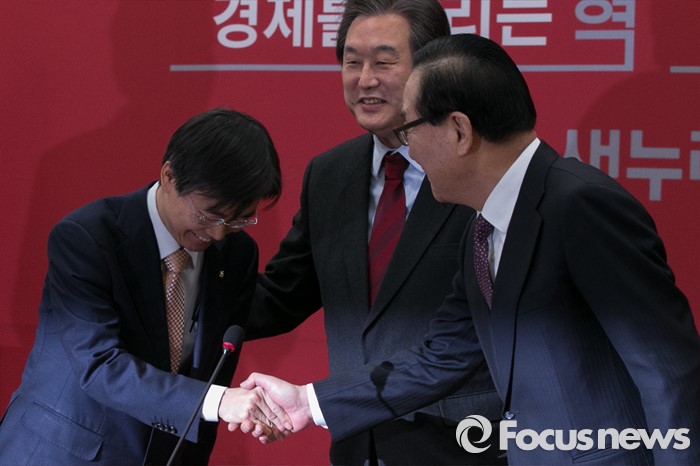 (서울=포커스뉴스) 더불어민주당을 탈당한 조경태(왼쪽) 의원이 21일 오전 서울 여의도 국회에서 열린 새누리당 최고위원회의에 참석해 입당 원서를 제출한 뒤, 서청원(오른쪽) 최고위원과 악수하고 있다.