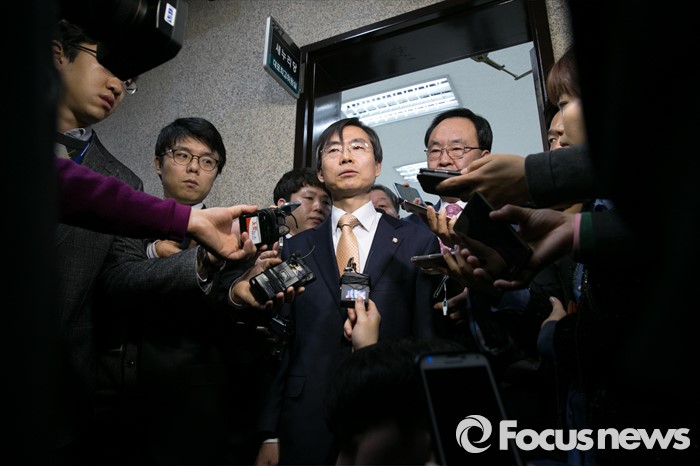 (서울=포커스뉴스) 더불어민주당을 탈당한 조경태 의원이 21일 오전 서울 여의도 국회에서 열린 새누리당 최고위원회의에 참석해 입당원서를 제출한 뒤 기자질문에 답변하고 있다.