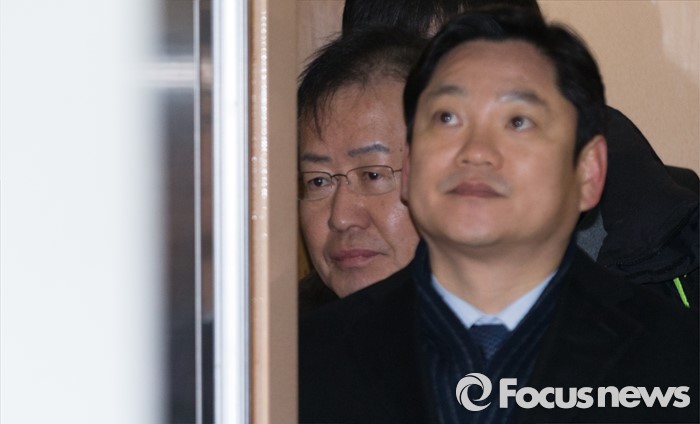 (서울=포커스뉴스) 고 성완종 전 경남기업 회장에게서 불법정치자금 1억원을 받은 혐의로 기소된 홍준표 경남지사가 21일 오전 첫 공판에 출석하기 위해 서울중앙지방법원으로 들어서 승강기에 탑승하고 있다.