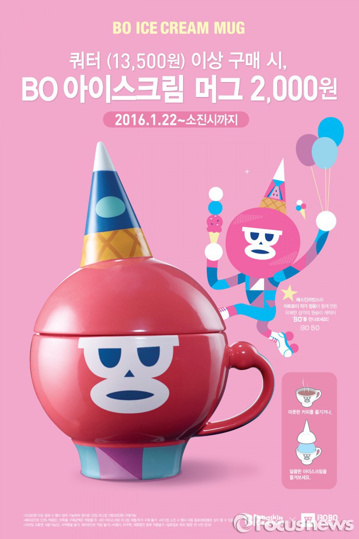(서울=포커스뉴스) 배스킨라빈스는 쿼터(1만3500원) 사이즈 이상을 구매하면 ‘BO 아이스크림 머그’를 2000원에 판매하는 프로모션을 오는 22일부터 진행한다.