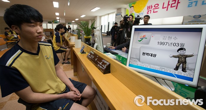 (서울=포커스뉴스) 2016년 첫 징병검사가 실시된 21일 오전 서울 영등포구 서울지방병무청에서 올해 첫 현역판정을 받은 김현수 씨가 현역 대상임을 통보받고 있다.