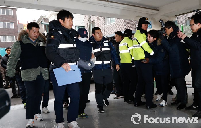 (부천=포커스뉴스) 부천 초등생 살해사건의 2차 현장검증이 실시된 21일 오전 피의자의 전 거주지로 알려진 부천 원미구 한 빌라에 피의자 최모 (33)씨가 범행 상황을 재연하기 위해 들어서고 있다.