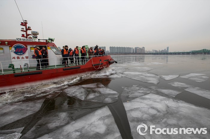 (서울=포커스뉴스) 절기상 '대한' 이며 한강이 공식 결빙된 것으로 발표된 21일 오전 서울 영등포구 여의도동 한강에서 119 특수구조단 수난구조대 대원들이 수난구조정을 동원, 쇄빙작업을 하고 있다. 한강 결빙 관측은 한강대교 노량진 방향 2번째와 4번째 교각 사이에서 이루어지며 상류 쪽으로 100m 부근의 남북 간 띠 모양 지점이 얼었는지에 따라 결빙 여부를 판정한다.