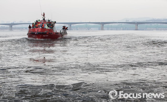 | △ 한파에 얼어버린 한강 쇄빙작업 중인 수난구조대 |