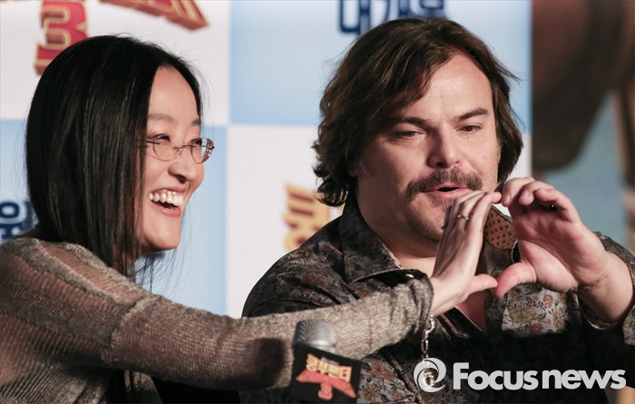 (서울=포커스뉴스) 21일 오전 서울 영등포구 콘래드 서울호텔에서 열린 쿵푸팬더3 기자간담회에 참석한 여인영 감독과 배우 잭 블랙이 포토타임을 갖고 있다.
