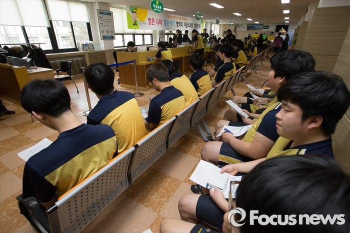 (서울=포커스뉴스) 2016년 첫 징병검사가 실시된 21일 오전 서울 영등포구 서울지방병무청에서 징병대상자들이 자신의 순서를 기다리고 있다.