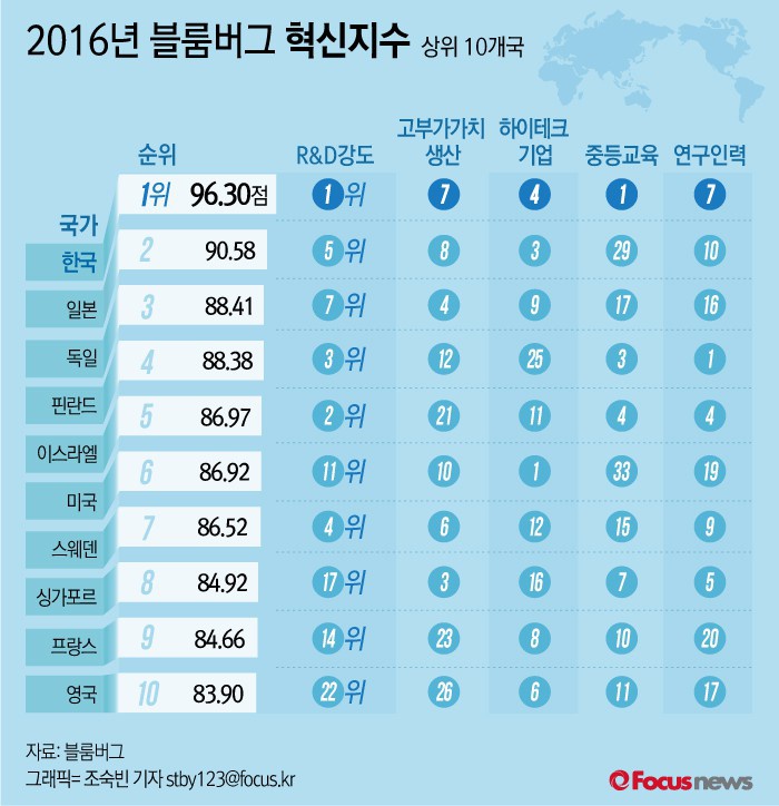 (서울=포커스뉴스) 19일(현지시간) 블룸버그 통신은 '2016 블룸버그 혁신 지수'에서 한국이 96.30점을 받아 조사 대상국 가운데 1위를 차지했다고 밝혔다.