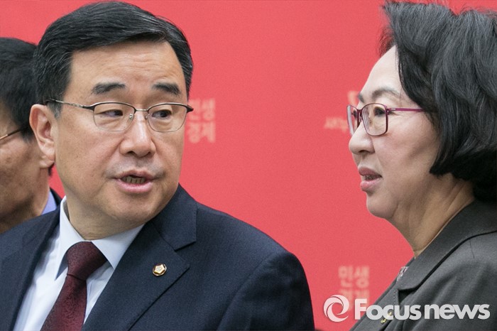 (서울=포커스뉴스) 김정훈(왼쪽) 새누리당 정책위의장과 박경실 서비스산업총연합회 회장이 21일 오전 서울 여의도 국회에서 열린 서비스산업발전기본법 조속 제정을 위한 경제계 간담회에 참석해 대화하고 있다.